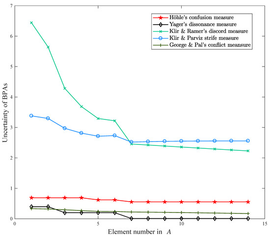The proposition A is a variable subset of with the number of single elements changing from 1 to 14. To verify the merit and effectiveness of the proposed belief entropy, eight uncertainty measures listed in Table 1 are selected for comparison, including Dubois and Prade’s weighted Hartley entropy [33], Höhle’s confusion uncertainty measure [34], Yager’s dissonance uncertainty measure [35], Klir and Ramer’s discord uncertainty measure [36], Klir and Parviz’s strife uncertainty measure [37], George and Pal’s conflict uncertainty measure [61], Pan and Deng’s uncertainty measure [40], Jiroušek and Shenoy’s uncertainty measure [41]. The experimental results are shown in Table 2. The Höhle’s confusion uncertainty measure (), Yager’s dissonance uncertainty measure (), Klir and Ramer’s discord uncertainty measure (), Klir and Parviz’s strife uncertainty measure (), and George and Pal’s conflict uncertainty measure () are plotted in Figure 1. The Dubois and Prade’s weighted Hartley entropy (), Pan and Deng’s uncertainty measure (), Jiroušek and Shenoy’s uncertainty measure (), and proposed belief entropy () are plotted in Figure 2.