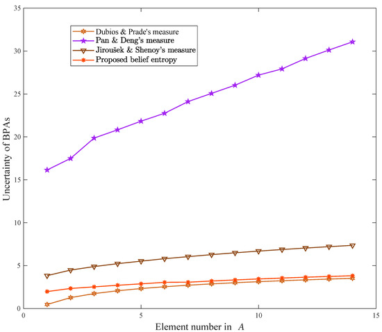 From Figure 2, it can be seen that the uncertainty degrees measured by Dubois and Prade’s weighted Hartley entropy, Pan and Deng’s uncertainty measure, Jiroušek and Shenoy’s uncertainty measure, and the proposed belief entropy are increasing visibly with the rising of the element number in A. These methods consider not only the discord uncertainty but also the non-specificity uncertainty. Furthermore, Pan and Deng’s uncertainty measure is the largest among all the methods in Table 2. This is understandable. The non-specificity uncertainty measure in Pan and Deng’s method is exponential, while the others are linear. As the number of elements in A increases, the uncertainty degree of Pan and Deng’s method increases faster than the other methods. Non-specificity uncertainty measure using exponential form may cause the possible uncertainty degree from the discord part to be significantly smaller than the ones from the non-specificity part. Additionally, Jiroušek and Shenoy’s uncertainty measure is larger than the proposed belief entropy. Compared to the Jiroušek and Shenoy’s uncertainty measure, which uses the probability distribution of single element obtained by plausibility transformation to measure the discord uncertainty, the proposed belief entropy measure that one by using the information of each mass function and the single element each BPA contains. The redundant information is removed, and the possible values of discord uncertainty is decreased notably in the proposed method. More importantly, except for the proposed method, the other three uncertainty measures have shortcomings. The Dubois and Prade’s weighted Hartley entropy does not consider the discord uncertainty of BPAs. The Pan and Deng’s uncertainty measure cannot measure accurately two similar BPAs in Section 5.5. The discord uncertainty measure of Jiroušek and Shenoy’s uncertainty measure is irrational in Section 5.6. Thus, the proposed belief entropy is the only effective approach for uncertainty measure among these given methods in this case. Therefore, the proposed belief entropy, which considers the information contained in BPAs and single elements, is reasonable and effective for uncertainty measure in Dempster-Shafer framework.