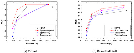 Figure 5 shows the typical example of MOS curve for Vidyo1 and BasketballDrill sequences among the spatial-only, temporal-only, spatio-temporal methods, and the H.265/HEVC reference model. From these figures, it can be seen that the proposed method shows visual quality improvements over the H.265/HEVC reference model, spatiotemporal methods, and temporal-only scenarios. Furthermore, when QP is set to 37,
