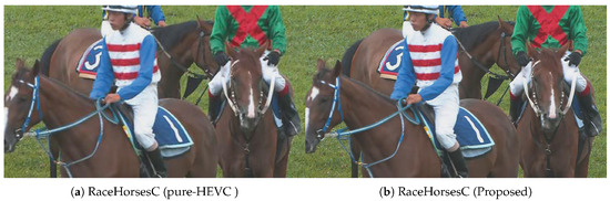 Figure 6 shows the difference between the image of pure-HEVC and the image of the proposed reconstructed video for RaceHorsesC sequence. As can be seen from the graphic, at the low bit-rate, the visual quality of the proposed method is better than the visual quality of pure-HEVC.