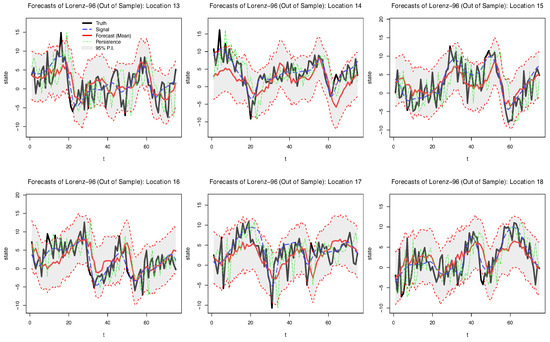 Posterior out-of-sample summaries for six of the 18 large-scale locations from the simulated multiscale Lorenz-96 data over 75 periods. The black line in each plot represents the true simulated value (data), while the red line denotes the forecasted posterior mean from the BAST-RNN model. The blue dashed line denotes the true signal of the process, defined to be the value of the large-scale locations in Equation (16) before the additive error, , is applied. The shaded grey area in each plot signifies the 95% posterior prediction intervals. The dotted green line denotes a persistence forecast (i.e., ).