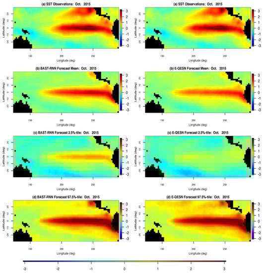 Comparison of the forecasting ability of the BAST-RNN model and the E-QESN model for the entire spatial domain can be seen in Figure 2 for October 2015. Occurring directly before the peak of the 2015–2016 ENSO cycle (see Figure 3), October 2015 represents an important month from the most recent ENSO cycle. Overall, both methods capture much of the warm intensity trend, with the BAST-RNN model forecasting a slightly higher intensity (especially for the Niño 3.4 region) compared to the E-QESN method. Although both methods appear to produce P.I.s with similar upper bounds, the P.I’s for the BAST-RNN are narrower, suggesting the model is more confident in its prediction of a warm period. Importantly, the highest intensity true values from the Niño 3.4 region for October 2015 are contained within the 95% P.I.s for the BAST-RNN model.