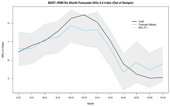 Furthermore, the BAST-RNN model is evaluated in terms of the previously described Niño 3.4 index in Figure 3. Much of the overall temporal nonlinear trend of the 2015–2016 ENSO cycle is captured by the BAST-RNN model, as shown in Figure 3, with nearly all of the true values contained within the 95% P.I.s. We should note, like the vast majority of ENSO forecasting models, the forecast mean from the BAST-RNN model also underestimates the peak of the ENSO cycle. Considering the 2015–2016 ENSO cycle was one of the most extreme ENSO cycles of recent record, i.e., [58], it is not entirely surprising that most models underestimated the peak of the cycle. However, it is important to reiterate that the out-of-sample forecast P.I.s for the BAST-RNN model still suggested the possibility of a large warming event during the true peak, unlike many other ENSO forecast models.