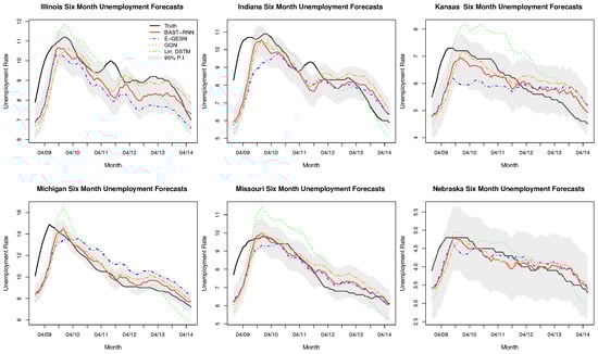 Seasonally adjusted monthly unemployment data were obtained from the publicly available Federal Reserve Bank of St. Louis (http://research.stlouisfed.org/fred2), for a period starting in January 1976 for the 12 states that make up the U.S. Census Bureau’s Midwest Region [67]. The period from December 2008 through June 2014 was designated as the out-of-sample period to evaluate the performance of the model. This period represents the most recent unemployment cycle caused by the Great Recession that started in 2008 and provides a nonlinear time series to assess the model. Using a lead time of six months, each model was trained on data from January 1976 through May 2008. The results in Table 3 show the BAST-RNN model to be a more accurate forecast model with higher quality uncertainty measures than the three competing models. From Figure 4 it is clear that all four models struggle with identifying the start of the unemployment cycle in 2009, with the BAST-RNN model generally recovering to accurately predict the states with peaks later in the cycle. Across the six states displayed in Figure 4 (selected to represent a range of different unemployment cycles in the region), the BAST-RNN model appears to be the most accurate in terms of forecasting the decrease in the unemployment rate during the recovery that followed the 2008 recession.