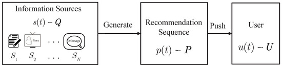 We consider a recommendation system with N classes of data, as shown in Figure 1. In fact, data is often stored based on its categories for the convenience of indexing. For example, the news website usually classifies news into the following categories: politics, entertainment, business, scientific, sports, and so on. At each time instant, the information source generates a piece of data, which belongs to a certain class with probability distribution Q. In general, the generated data sequence does not match the preference of the user. To optimize the information transmission process, therefore, a recommendation unit is used to determine whether the generated data should be pushed to the user with some deliberately designed probability distribution P. One the one hand, the recommendation unit can make predictions of the user’s needs and push some data to the user before he actually starts the retrieval process. In doing so, the transmission delay can be largely reduced, especially when the data amount is large. On the other hand, the recommending unit enables non-expert users to search and to access their desired data much easier. Furthermore, we can profit more by pushing some advertisements to the user.