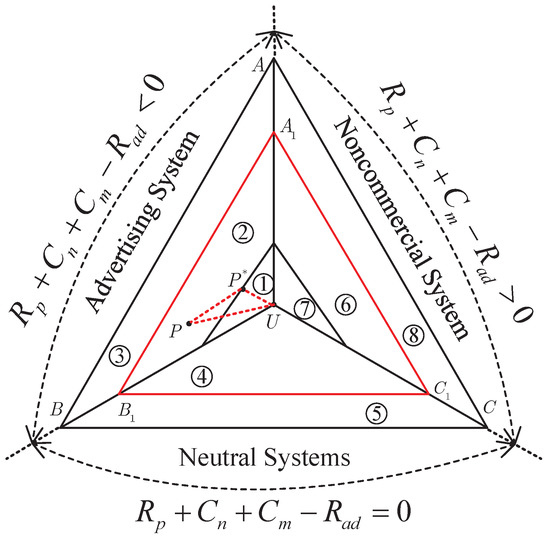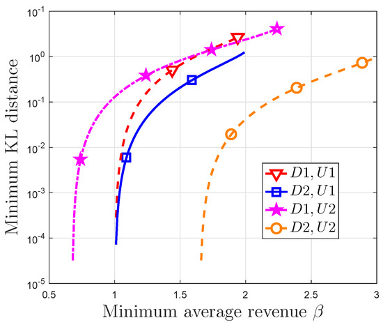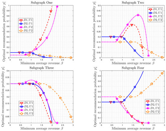 Subgraph two of Figure 5 depicts the optimal recommendation probability versus the minimum average revenue. If , the optimal recommendation probability is equal to the corresponding utility probability. If or , in the four cases will decrease from to zero. In this case, increases at the early stage and then decreases for D1, U1 and D1, U2, while is monotonously increasing for D2, U1 and D2, U2. Since , for D1 and for D2, these numerical results agree with the discussion in Section 4.1. Subgraph three is similar to the Subgraph two.