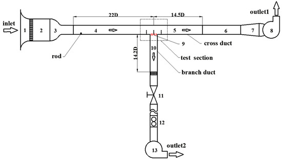 Schematic diagram of experimental system: 1-Entrance, 2-Settling chamber, 3-Contraction section, 4-Front section of cross duct, 5-Back section of cross duct, 6-Connect section, 7-Expansion section, 8-Fan, 9-Blades, 10-Branch duct, 11-Valve, 12- Glass rotameter, 13-Fan.