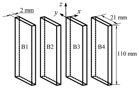 To investigate the influencing factors of the flow near the vents of high-speed trains, an experimental system in the form of T-junction was built to mimic a real situation. This experiment was carried out in a low-speed wind tunnel with a maximum speed of 57 m/s. A schematic diagram of experimental system is illustrated in Figure 1. The cross duct has a length of 36.5 D and its cross-sectional area is z × y = 161.7 × 143.3 mm2. The branch duct is 14.2 D long and its cross-sectional area is a square with a side length of D = 110 mm. To simulate the grating of the train vent, four vertical blades were mounted equidistantly on the inlet section of the branch duct. Each of them is 2.0 × 21.0 × 110.0 mm3 in size, as shown in Figure 2. In order to ensure that the turbulence is fully developed as soon as possible, a 2.0 mm rod was placed in the entrance of cross duct. The coordinate system is used herein, the origin of the coordinate is at the inlet center of the branch duct (as shown in Figure 3). The x, y and z axes are aligned with the streamwise, wall-normal and spanwise directions of the cross duct, respectively.