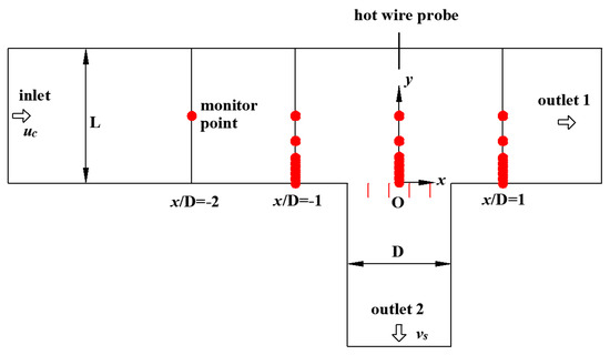 The centre velocities of the cross duct in the experiment were 30, 40, and 50 m/s, respectively, and the velocity ratios were 0.08, 0.13, and 0.18. The experimental conditions are listed in Table 1. The measurement sections were x/D = −1, x/D = 0, x/D = 1 and eight measurement points were selected varying from y/L = 0.0070 to 0.5000 at each section as presented in Figure 3. Note, L is the height of the cross duct. All processing and analysis of data were carried out with the MATLAB software.