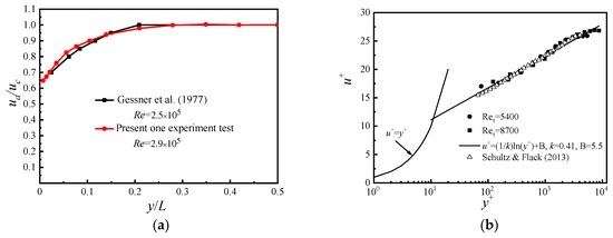 The results are shown in Figure 4a and consistency between our experiment and Gessner’s was found. The wall velocity distribution curve at x/D = −5 was compared with the results of Schultz and Flack [26], and the result is shown in Figure 4b. There is also a good conformity. Detailed information can be found in Su et al. [6].