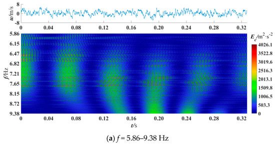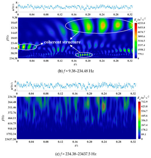 In Figure 5a, large-scale high-energy coherent structures can be found over the whole time period with a scale frequency range of 5.86–9.38 Hz, but they are not very clear. The high-energy coherent structure was defined as those whose value of energy accounts for more than 33% of the maximum value, as shown in Figure 5b. There, except for the five large-scale coherent structures with the dominant scale frequency of 12.34 Hz, there are three coherent structures at 0–0.04 s with a dominant scale frequency of 30 Hz. Coherent structures with a scale frequency of 60 Hz can be found at 0.10–0.12 s and 0.29–0.32 s. There are also coherent structures at 0.17–0.20 s whose scale frequency is more than 100 Hz. The presence of large-scale coherent structures is hardly observed in Figure 5c. What’s more, the peak value of energy is Ec = 712.9 m2/s2, or 7.7 times lower than that in Figure 5b. The above description shows that coherent structures with large energy exist with a frequency of 9.38–234.38 Hz, and they play a vital role in the transport of mass and energy. Therefore, the frequency of the coherent structures studied in this paper ranges from 9.38–234.38 Hz (corresponding to scale dilation a of 200–5000), which is consistent with the results of Su et al. [6]. This may indicate that the presence of blades does not remarkably change the frequency range of coherent structures.