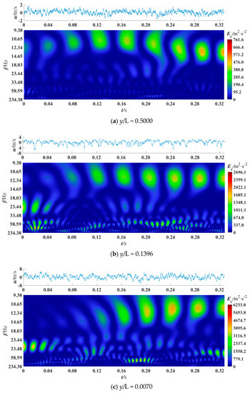 Figure 6 shows the wavelet power spectrum at different locations away from the wall (y/L = 0.0070–0.5000). They were all measured with x/D = 0, R = 0.13, uc = 40 m/s. In Figure 6a, at y/L = 0.5000, the coherent structures with the maximum energy value of Ec = 761.6 m2/s2 appear at 0.08–0.32 s, whose dominant scale frequency is 9.38–14.65 Hz. In Figure 6b, at y/L = 0.1396, besides the coherent structures of 12.34 Hz at 0.12–0.32s, the coherent structure of 23.44 Hz appears in 0–0.04 s. The coherent structures with the largest energy value appear in the high-frequency band of about 100 Hz. The peak value of energy is 2696.1 m2/s2. In Figure 6c, at y/L = 0.0070, the scale frequency of the coherent structures is wider, including low-frequency of 9.38–14.65 Hz, 24–40 Hz and some high-frequency coherent structures of 100 Hz and greater than 100 Hz. The peak value of energy is 6233.0 m2/s2, which is 7.2 times higher than that in Figure 6a and 1.3 times higher than that in Figure 6b. The similarity among the three figures is the periodic distribution of coherent structures: they are all periodic in term of time but in an uncertain period. That is consistent with the characteristic of quasi-periodic of the coherent structures. And the tendency of large-scale coherent structures separating into small-scale coherent structures can also be seen. That means the event of energy cascade occurring. However, in areas far from the wall, the coherent structure contains less energy and the frequency range is not as big as the near wall area. That indicates that there are more coherent structures triggered near the wall (y/L = 0.0070). Therefore, in the following figures, the distribution of coherent structures in the near-wall region was mainly concerned.