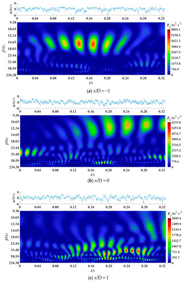 Figure 7 presents wavelet power spectra at different cross sections. The other parameters are uc = 40 m/s, R = 0.13, y/L = 0.0070. In Figure 7a, at x/D = −1, there are six large-scale high-energy coherent structures with a frequency of 12.34–18.03 Hz at 0.08–0.24 s, and the peak value of the energy is 5895.1 m2/s2. In Figure 7b, at x/D = 0, the coherent structures span a wider scale frequency range. Within 0.16–0.32 s, there are six high-energy coherent structures with the scale frequency about 12.34 Hz. There are four coherent structures with a frequency of 30 Hz at 0–0.04 s, and six small-scale high-frequency (more than 100 Hz) coherent structures at 0.17–0.20 s. Coherent structures with a scale frequency of about 60 Hz also exist at 0.10–0.12 s and 0.29–0.32 s, respectively. The peak value of energy is 6233.0.4 m2/s2.