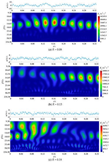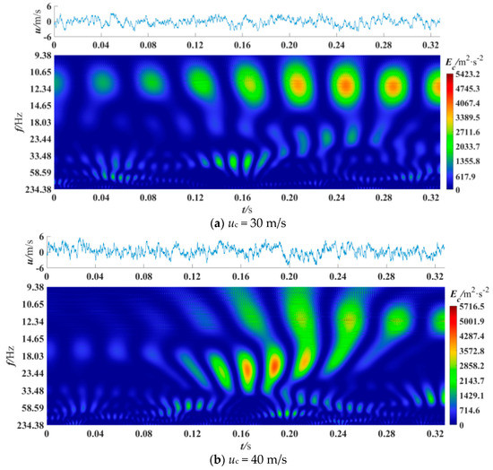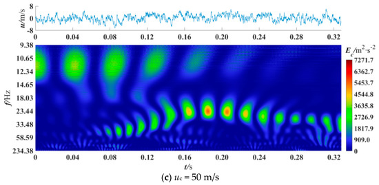 In Figure 8c, at uc = 50 m/s (Rec = 4.75 × 105) there are four large-scale coherent structures at 0–0.12 s with a dominant scale frequency of 11 Hz, and the highest energy coherent structures appear at 0.16–0.20 s with the scale frequency band of 23.44–33.48 Hz. A number of small-scale coherent structures with frequency of 50 Hz and 33 Hz are seen at 0.08–0.32 s. As the cross velocity increases, the peak value of energy also increases.