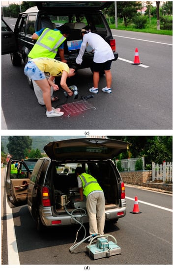 Field tests: (a) the 3-D scanner; (b) sand patch test for the mean texture depth (MTD); (c) Scanning test; and (d) dynamic friction tester (DFT) test.
