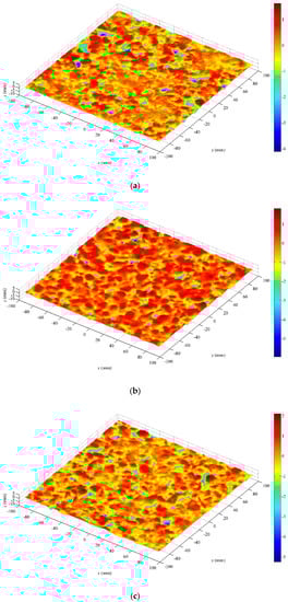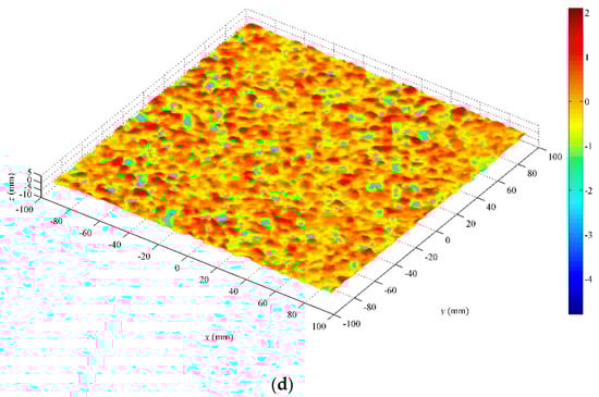 A commercial hand-held 3-D laser scanner (Creaform Inc., Lévis, QC, Canada), based on the laser triangulation technique, is used to collect the three-dimensional macro and micro textures of the pavement surface. The scanner consists of three charge-coupled devices (CCDs) and a cross laser [24]. By collecting the coordinates of a series of points on the surface of the object, the 3-D image of the surface can be obtained. The minimum sampling point spacing is 0.05 mm, and the measuring accuracy is 0.04 mm. The test results can be outputted to a variety of standard 3-D image file formats, such as stl., iges., etc. For more detailed information, refer to [7]. Figure 1 shows the field test photos. For the macrotexture, in the first two tests, the sampling size was 90 mm × 90 mm, and in the last five tests, the sampling size was 190 mm × 190 mm. All macrotexture scanners use a sampling interval of 0.4 mm to edit the 3-D images obtained by scanning. First, the commercial 3-D image software Geomagic Studio (3D Systems, Inc., Research Triangle Park, NC, USA) is used to edit the images, and then the data is transformed into ordered point clouds with an equal spacing distribution in two horizontal directions through the simulation scanning tool. Furthermore, the Fast Fourier Transform is used to filter the part whose wavelength exceeds 50 mm. According to [4], these components are beyond the scope of the macrotexture. The ordered point cloud data with a sampling interval of 0.5 mm in the x and y directions are finally obtained, and used for the macrotexture analysis. The detailed information was described in detail in [7]. For the microtexture, the test method was the same as for the macrotexture, except that a sampling interval of 0.05 mm was used. Based on the scanned three-dimensional data, the filtering process is carried out according to the frequency and wavelength range of the microtexture [4]. Finally, the ordered point cloud data with a size of 5 mm × 5 mm and a sampling interval of 0.05 mm in the x and y directions are obtained for the analysis of the microtexture. One macrotexture and two microtextures are collected at each test point. Figure 2 is the result of typical macrotexture testing after filtering, and Figure 3 is the result of a typical microtexture by measuring and after filtering. For the macrotexture, since only the part whose wavelength is larger than 50 mm is filtered out, this wavelength value is several times the size of the particle exposed on the pavement surface, and the filtered image has not intuitively changed. For the microtexture, because it is necessary to filter out the part whose wavelength is more than 0.5 mm, which is much smaller than the size of the particle exposed on the pavement surface, the filtered microtexture loses the true morphology characteristics of the pavement surface.