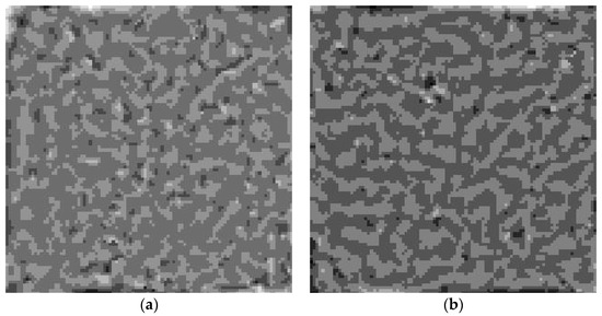 The 3-D texture measurements should be converted into grey-level images so that they can be characterized by entropy. First, the height range of a given 3-D texture measurement is divided into sections using a given interval. Following this, a corresponding grey-level image is obtained through mapping each height section onto a grey level. Reference [24] describes the conversion techniques in detail. Figure 4 and Figure 5 depict the grey-level images corresponding to the 3-D measurements in Figure 2 and Figure 3, respectively. Finally, the Entropy E can be calculated for each 3-D texture measurement in accordance with Equation (3).