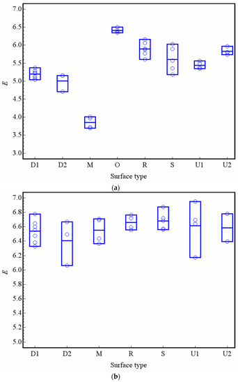 Figure 6 presents the entropy distribution of the macrotexture and microtexture of different types of pavements, where D1 and D2 represents the DAC pavement, M represents the MS pavement, O represents the OGFC pavement, R represents the RAC pavement, S represents the SMA pavement, and U1 and U2 represent the UTWC pavements constructed over different years. The detailed information of various pavement parameters is referred to in [29]. As shown in Figure 6a, there are significant differences in the entropy of the macrotexture of different types of pavement surfaces. Among them, the entropy of MS pavement is the smallest and that of OGFC pavement is the largest. It is noted that there is a clear distinction between U1 and U2, in which U1 is the pavement opened in September, 2009, and U2 is the pavement opened in September, 2010; this indicates that entropy can be used to describe the macrotexture decay of the pavement surface. Figure 6a has the same distribution trends as those of previous research [24], indicating that the use of entropy is reasonable and accurate. For the microtexture, the range of the entropy distribution is narrow (Figure 6b), and the difference between different pavements is not very obvious. This may be because the microtexture is mainly affected by mineral aggregates and is less affected by mixture gradation.