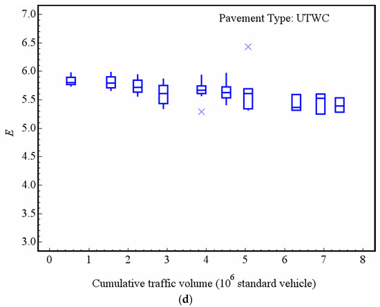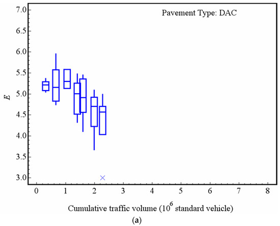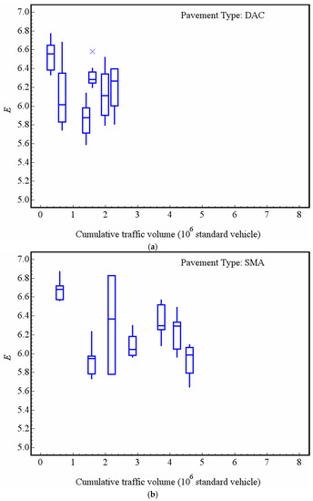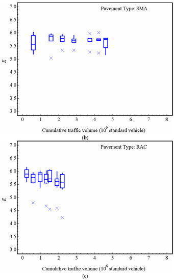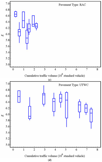 In order to analyze the decay of the macrotexture of the asphalt pavement by the entropy value, the experimental data is grouped according to the type of pavement and cumulative traffic volume of service. Figure 7 presents the changes of entropy of the macrotextures of DAC, SMA, RAC and UTWC pavement surfaces with cumulative traffic volume by box-and-whisker plots, in which the mark inside the box is the median, the lower and the upper edges of the box are the 1st and 3rd quartiles, respectively, and the “x” are the outliers. Before analyzing the decay trend, it is necessary to note that the aggregate types used in the four types of pavement are not identical. DAC and RAC pavements used one type of aggregate, while SMA and UTWC pavement used another type. In the early service stage of roads, the entropy of the RAC surface macrotexture is the largest amongst the four types of pavement, with an average value of 5.90 (after a 0.22 × 106 standard vehicle passes), followed by the UTWC and SMA pavements, with an average value of 5.83 (after a 0.54 × 106 standard vehicle passes) and 5.61 (after a 0.59 × 106 standard passes), respectively. The entropy of the surface macrotexture of DAC is the smallest, with an average value of 5.20 (after a 0.31 × 106 standard vehicle passes). Despite some fluctuations in data, for the DAC, RAC and UTWC pavements, it is clear that the entropy of the macrotexture of the pavement surface decreases gradually with the increase of the cumulative traffic volume. The DAC pavement decay is the most obvious. After a 2.29 × 106 standard vehicle passes, the average entropy of DAC’s macrotexture decays to 4.34, and the average entropy of DAC’s macrotexture decays to 8.37% for every 1 × 106 standard vehicle passing. After a 2.20 × 106 standard vehicle passes, the average entropy of RAC’s macrotexture decays to 5.48, with an average decay rate of 3.6% for every 1 × 106 standard vehicle passing. After a 7.40 × 106 standard vehicle passes UTWC, the average entropy of the macrotexture decays to 5.40, and the average decay rate is 1.07% for every 1 × 106 standard vehicle passing, respectively. The entropy of the macrotexture of the SMA pavement surface does not obviously decay. After a 4.61 × 106 standard vehicle passes, the average entropy of the macrotexture is still 5.59, which is basically consistent with the mean value of a 0.59 × 106 standard vehicle passing. The analysis using entropy theory obtains similar results compared with our previous research [29]. Pavements with different gradations will have different sizes of aggregates exposed on the surfaces. Due to the difference of wear performance of different size particles, there are different decay trends in the macrotexture of different pavements. On the other hand, the difference of aggregate types should also be noticed.