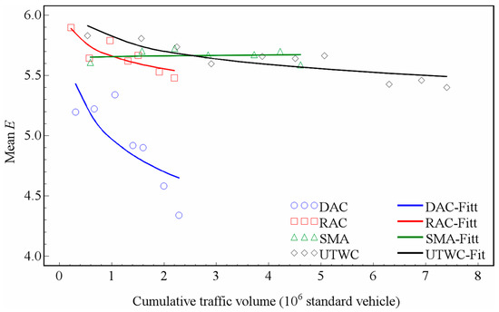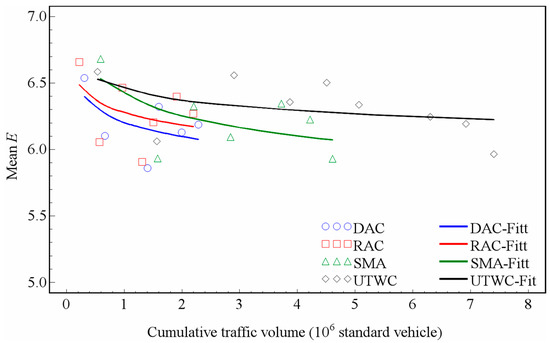 According to Equation (4), the coefficient a described the decay rate. The smaller the value of a, the faster the decay rate. As mentioned above, the DAC and RAC pavements have one same aggregate type, and the SMA and UTWC pavements have another type. Because the aggregate type has a potential impact on the pavement wear, the decay of the macrotexture entropy of the pavement surface should take the difference between different aggregate types into account. From Table 3 and Figure 8, it can be seen that the macrotexture of the DAC pavement decreases fastest. The RAC and UTWC pavements have a similar macrotexture decay trend. The SMA pavement maintains a stable entropy after 4.61 × 106 standard vehicle passes, which should be attributed to the specific gradation of SMA. Note that the trends using the mean entropy are very similar to those from the previous analysis [29], which validates our research accuracy.