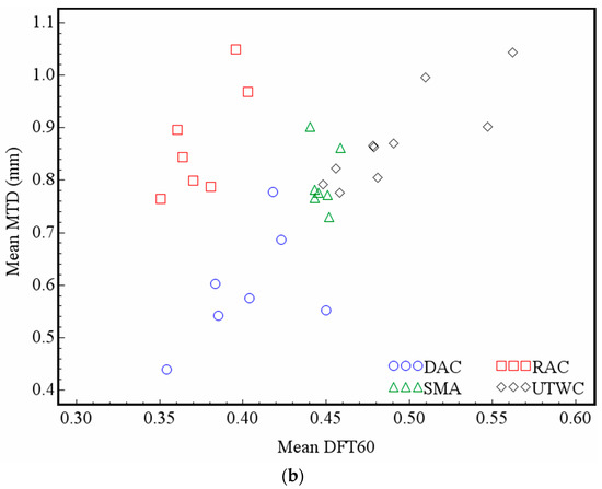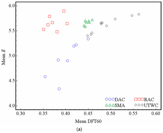 It can be seen from Table 4 that for the DAC, RAC, and UTWC pavements, there is a certain correlation between entropy and MTD. However, the Pearson correlation coefficients are below 0.8, and there is no significant correlation between the entropy and MTD of the SMA pavement. This shows that entropy describes some features of the macrotexture of the pavement surface, which the MTD indexes fail to describe. Comparing the correlations between entropy, MTD and DFT60, it is found that the Pearson correlation coefficients of entropy and DFT60 are significantly higher than those of MTD and DFT60 except for RAC. For the DAC, SMA and UTWC pavements, the correlation coefficients of entropy and DFT60 are 0.2960, 0.6401 and 0.0695 higher than the Pearson correlation coefficients of MTD and DFT60, respectively. This shows that entropy has more advantages than MTD in describing the impact of macrotexture on the anti-skid performance of asphalt pavement. Figure 9 plots DFT60 against the entropy E and MTD of different types of asphalt pavements, which could more intuitively reflect the advantages of E.
