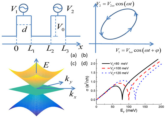 (a) schematics of the adiabatic quantum pump. Two time-dependent gate voltages with identical width d and equilibrium strength are applied to the conductor. Time variation of the two potentials and and is shown in panel (b). and have a phase difference giving rise to a looped trajectory after one driving period; (c) two-dimensional band structure of the pseudospin-1 Dirac–Weyl fermions with a flat band intersected two Dirac cones at the apexes; (d) conductivity of the pseudospin-1 Dirac–Weyl fermions measured by [54] in single-barrier tunneling junction as a function of the Fermi energy for three different values of barrier height . is the Fermi wavevector and t is the transmission amplitude defined in Equation (5). It can be seen that higher barrier allowing larger conductivity occurs at the Dirac point and around (see the text).