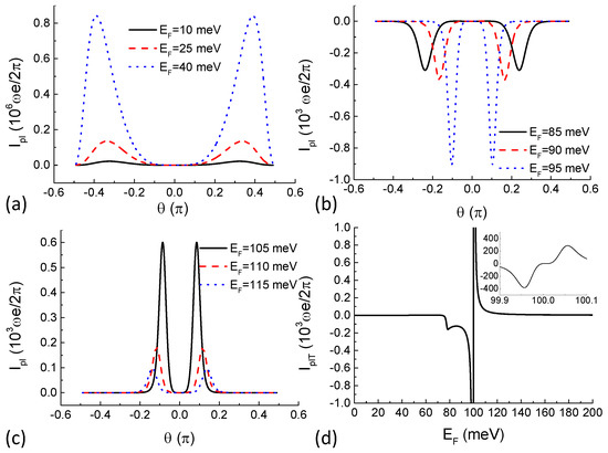 Numerical results of the pumped current are shown in Figure 2. It can be seen from Figure 1d that when the value of is between 70 meV and 100 meV, conductivity through higher potential barriers is larger than that through lower barriers. Angular dependence of the pumped current at Fermi energies selected within this range is shown in Figure 2b. With fixed at , potential barrier starts lowering first and then it rises and starts lowering. Usually (like in a semiconductor heterostructure), higher potential barriers give rise to smaller transmission probability. The process can be interpreted as “gate” “opens” first allowing one particle to enter the middle single-particle state from the left reservoir and then it “closes” and “gate” “opens” allowing the particle to leave the device and enter the right reservoir. This completes a pump cycle and a DC current is generated. Such is the classical turnstile picture of the pumping mechanism. However, for pseudospin-1 Dirac–Weyl fermions, higher potential barriers give rise to larger transmission probability under certain parameter settings as demonstrated in Figure 1d. In the classical turnstile picture, this means that the definition of “opening” and “closing” of the "gate" is reversed. This is the reason for the negative (direction-reversed) pumped current shown in Figure 2b.