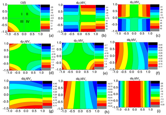 Contours of the Berry curvature and the eight derivatives on the right-hand side of Equation (10) in the - parameter space. For all the subfigures, the horizonal and vertical axes are and in the unit of meV, respectively. The magnitudes of the contours are in the scale of (a) ; (b) ; (c) ; (d) ; (e) ; (f) ; (g) ; (h); (i) ; and (j) , respectively. Other parameters are meV, nm, nm, meV, and in radians. For convenience of discussion, the parameter space in the nine panels is divided into four blocks: I ( and ), II ( and ), III ( and ), and IV ( and ). The four blocks are illustrated in (a).