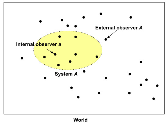 An internal observer belongs to an observed system as a component. Internal observers do not observe entirely the partial system to which they belong to (e.g., system A in Figure 1); instead, they each observe their environments (the rest of the system) that interact with them—this environment should not be confused with “the environment of the system”. For example, when you observe a person in conversation with yourself, your observation occurs internally in the two-person system, consisting of the person and you. The person you observe is your environment, and this environment also observes you.
