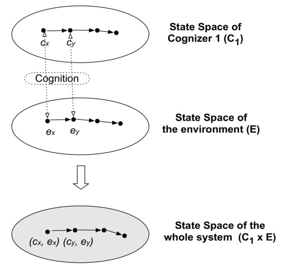 Consider the two-cognizers system of a focal cognizer, C, and its environment, E, with motion functions fC and fE, respectively. Here, fC: U → C, fE: U → E, where C, E, and U (= C × E) are the state spaces of the focal cognizer (C), the cognizer’s environment (E), and the world (U), respectively. F(ui) can then be expressed as (fC (ui), fE (ui)), where ui = (ci, ei). Designating (fC(ui), fE(ui)) as (fC, fE) (ui) = F(ui), where (fC, fE) () is denoted as F(). fC determines one successor state of C, cj uniquely in terms of a given world state, ui (= (ci, ei)). This transition is expressed as fC(ci, ei) = cj. Similarly, fE determines a successor state of E, ej, uniquely in terms of a given world state, which is expressed as fE(ci, ei) = ej (ci, cj ∈ C, ei, ej ∈ E). As such, the causal principle is obtained in terms of cognizers.