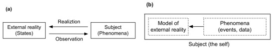 In the philosophy of perception, sense data indicate percepts that occur immediately in the self or the mind. According to Russel [13] (Chapter 1), sense data are “the things that are immediately known in sensation: Such things as colors, sounds, smells, hardness, roughness, and so on”. In the standard usage of this term, sense data are the kind of thing we are directly (or immediately) aware of in perception, not something derived from direct awareness. For example, when one sees a table, the percept “this table” is not a sense datum, which is a mental idea derived from such sense data as shapes and colors. The idea of “table” is a percept that is indirectly derived from these sense data, occurring in the mind. However, there is no validation that sense data are caused by something existing independently of the self, which can be understood by considering sense data occur in hallucination and dreams [45,46]. In this paper, immediate percepts like sense data and derived data are not distinguished in the internalist model because they differ only in meaning to the self. Solipsism holds that I (the self) alone exists, and others are representations of the self. This proposition cannot be proved to be false. A possible resolution of the issue of E-O circularity is to find a way to constitute representations for the external reality (i.e., “inverse causality” in this paper), which is consistent with the externalist model (i.e., “measurement” in this paper).