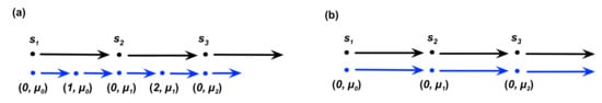 In Figure 6a, the sensor changes state from (0, μ0) to (1, μ0) by cognizing the system in state s1, which is a discriminative cognition and also functions as an ICM measurement. In this process, the memory now cognizes the sensor in state 1 and changes from μ0 to μ1. The sensor then returns to the basal state 0, and the entire state of the observer becomes (0, μ1). This observer’s cognition is represented by clarifying the intermediate state, (1, μ0) between (0, μ0) to (0, μ1), as shown in Figure 6a. If the intermediate states between (0, μi) and (0, μi+1) are concealed, the process is obtained as shown in Figure 6b. Cognition by an EO determines a unit time, and therefore the timescale of the observed system.