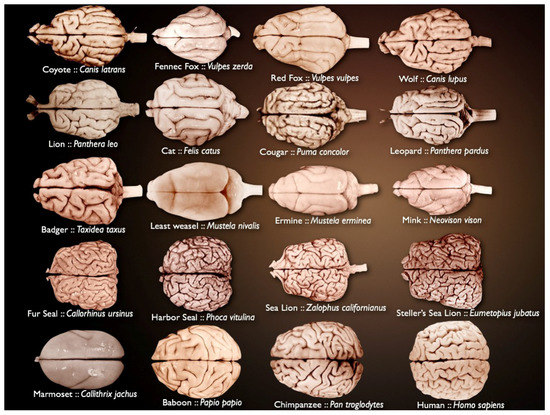 Different mammalian brains, varying in size and complexity (source: National Museum of Health and Medicine’s University of Wisconsin and Michigan State Comparative Mammalian Brain Collections [21]).