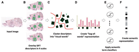 Illustration of the image processing pipeline: (A) original image in pixel grayscale indicating level of gene expression; (B) local SIFT descriptors are extracted from image at four resolutions; (C) descriptors from all 16,351 images are clustered into 500 representative “visual words” for each resolution level using k-means; (D) each image is represented as a histogram counting the occurrences of visual words; (E) -regularized logistic regression classifiers applied to 2081 GO categories; and (F) final 2081 dimensional image representation (source: Liscovitch et al. [12]).