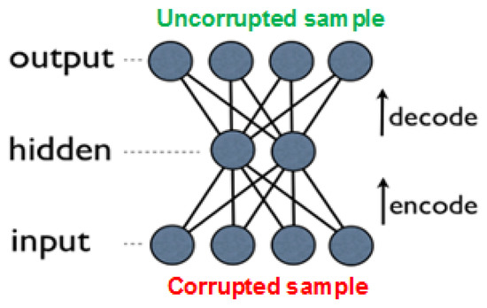 An improved approach, which outperforms basic autoencoders in many tasks, is due to denoising autoencoders (DAEs) [29,31]. These are built as regular AEs, where each input is corrupted by added noise, or by setting to zero some portion of the values. Although the input sample is corrupted, the network’s objective is to produce the original (uncorrupted) values in the output layer (see Figure 6). Forcing the network to recreate the uncorrupted values results in reduced network overfitting (also due to the fact that the network rarely receives the same input twice), and in extraction of more high-level features. Note that the noise is added only during training, while in prediction time the network is given the uncorrupted input.
