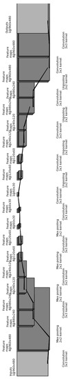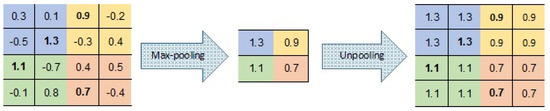 There are a number of variants to the unpooling operation (see, e.g., [35,36,37]). In our CAE, unpooling simply duplicates the same maximal value in the corresponding 2 × 2 window of the next layer (Figure 7). This means that there is no need to record the locations of the maxima within each pooling region.