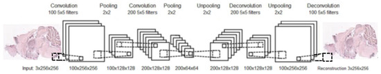 Similarly to an AE, after training a CAE, the unpooling and deconvolutional layers are removed. At this point, a neural network, composed from convolution and pooling layers, can be used to find a functional representation, as in our case, or initialize a supervised CNN. An example of a complete structure of a convolutional autoencoder is presented in Figure 8.