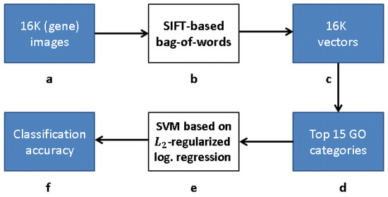 Processing pipeline [12]: (a) 16K original images in pixel grayscale indicating level of gene expression; (b) “bag-of-words” via clustering clustering of SIFT feature descriptors; (c) vector representation due to bag-of-words; (d) 16K vectors trained with respect to each of 15 GO categories with best AUC classification in [12]; (e) -regularized logistic regression classifiers for top 15 GO categories; and (f) classification accuracy obtained.