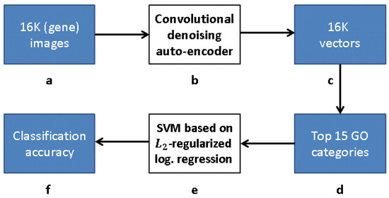 Our work flow: (a) 16K grayscale images indicating level of gene expression; (b) CDAE-based feature extraction for a compact vector representation of each gene; (c) vector representation due to feature extraction; (d) 16K vectors trained with respect to each of 15 GO categories with best AUC classification in [12]; (e) -regularized logistic regression classifiers for top 15 GO categories, and (f) classification accuracy obtained.