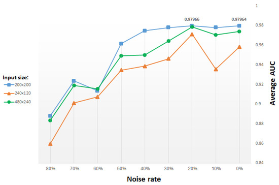 For each input size, the average AUC drops when the denoising rate increases above 30% (i.e., when 30% pixels selected randomly are set to zero). For small denoising rates, the average results improve slightly for added noise, reaching a peak for a denoising rate of roughly 20%. Thus, we use for most of our study a denoising rate of 20%, for which the best results are obtained.