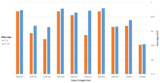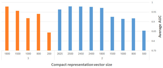 Figure 13 presents the maximum (over all runs) of the average AUC results for different representation vector sizes, using our CDAE. The plots depicted on the right- and left-hand side of the figure correspond to two and three max-pooling layers, respectively. (We used here merely two and three max-pooling layers on smaller input images, in order to save considerable run-time during the experimentation. The performance of the system is reported eventually for the resampled images of size 960 × 480 pixels using four max-pooling layers.) The filter size was fixed to 3 × 3, while other network hyper-parameters (e.g., learning rate, number of convolutional layers, etc.) were experimented with to find the best results. The following general observation can be made: the larger the representation vector, the better the performance. The combined objective should thus be to work with the largest possible images and with as compact representation vectors as possible, while still meeting a required level of classification accuracy.