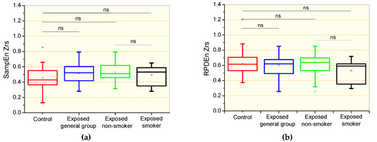 Sample entropy of the respiratory impedance (SampEnZrs, a); recurrence period density entropy of the respiratory impedance signal (RPDEnZrs, b) in controls, the general patient group, including non-smokers and smokers, patients exposed to asbestos non-smokers, and patients exposed and smokers. The top and the bottom of the box plot represent the 25th- to 75th-percentile values, while the circle represents the mean value, and the bar across the box represents the 50th-percentile value. The whiskers outside the box represent the 10th-to 90th-percentile values. Ns = non-significant.