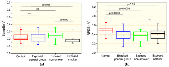 Sample entropy of the airflow signal (SampEnV’, a) and recurrence period density entropy of the airflow signal (RPDEnV’, b) in controls, the general group of patients including smokers and non-smokers, patients exposed to asbestos who were non-smokers, and patients exposed and smokers. The top and the bottom of the box plot represent the 25th- to 75th-percentile values, while the circle represents the mean value, and the bar across the box represents the 50th-percentile value. The whiskers outside the box represent the 10th-to 90th-percentile values. Ns = non-significant.