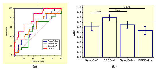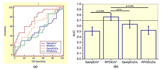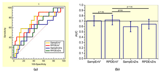 (a) Receiver-operating characteristic curves associated with the values presented in Table 8, describing analysis in smoker patients. (b) Comparative analysis of the ability of the studied entropy indexes to diagnose initial respiratory changes in smoker asbestos-exposed workers. The dotted horizontal line describes the minimal value of AUC considered adequate for clinical use. Ns = non-significant.