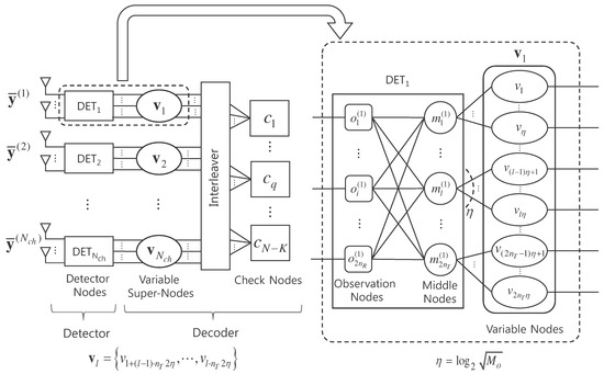 At the end of detection iterations, the log-likelihood ratios (LLR) of coded bits are computed at middle nodes in the following manner and delivered to the decoder. We suppose that a variable node