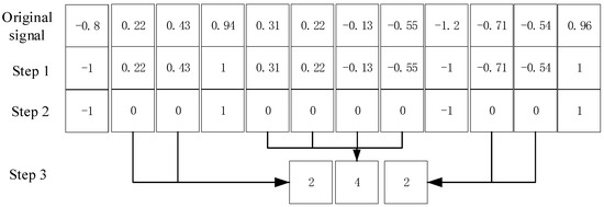 (2) Set the values of non-extreme points as zero, and then there are only −1, 0 and 1 in the signals. Thus, IMF is changed into an integer sequence.