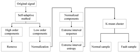 In this part, extreme interval entropy is applied in two experiments of fault diagnosis with EMD and EWT, and K-mean cluster is selected to evaluate the performance of given features. According to Section 2, the experiment can be described as Figure 2. Firstly, the components from the self-adaptive method should be obtained such as IMF. Subsequently, the components are normalized, and the signal is restructured using −1, 0 and 1 only. Then, the extreme interval sequence is calculated for each normalized component, and K-mean cluster is introduced with extreme interval entropy for realizing the classification.