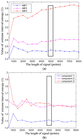 The extreme interval entropies based on (a) EMD and (b) EWT.