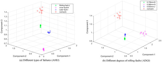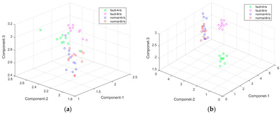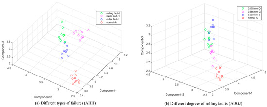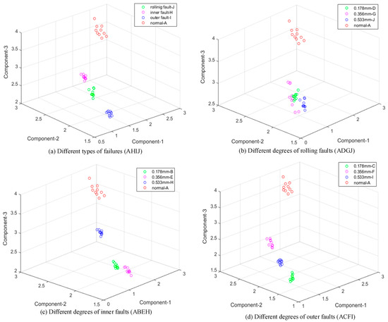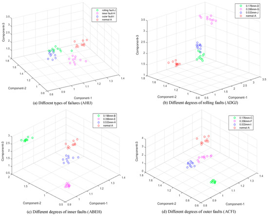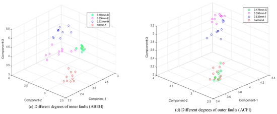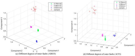 The extreme interval entropies of all samples in Table 1 are calculated based on both EMD and EWT; then, their spatial distributions were drawn with the first three order extreme interval entropies as three-dimensional coordinates, recorded in Figure 6 and Figure 7. Compared with Figure 6a and Figure 7a, it can be seen clearly that the proposed feature has an ability to identify these four bearing faults obviously. Compared to Figure 6b–d and Figure 7b–d, it is found that the given method can identify faults with three different degrees and the normal sample well.