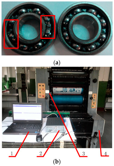 The proposed method was applied to the fault diagnosis of rolling bearing in a printing press. A printing press for offset, GUANGHUA 650, was used. The testing bearing was NSK 6001Z mounted on the both ends of ink rollers and water rollers of the equipment. The bearing fault in a printing press is normally easy to be damaged since the printing process involves a large number of chemical solvents such as ink, alcohol, embossing liquid, etc. The printing pressure also shortens the service life during the contact between rollers. As a result, the main fault of rolling bearings in this condition was the roller misalignment caused by cage damage under chemical and pressure actions. This kind of fault is different from the experiment in Section 3.1 and Section 3.2 [35,36]. In this experiment, fault samples were made artificially to simulate the working condition, and the cage fault of rolling bearing was caused by an electro-discharge machining. The rolling bearings used in experiment are shown in Figure 10a; the bearing with a damaged cage is on the left while a normal one is on the other side, and the typical fault area has been marked with red color.